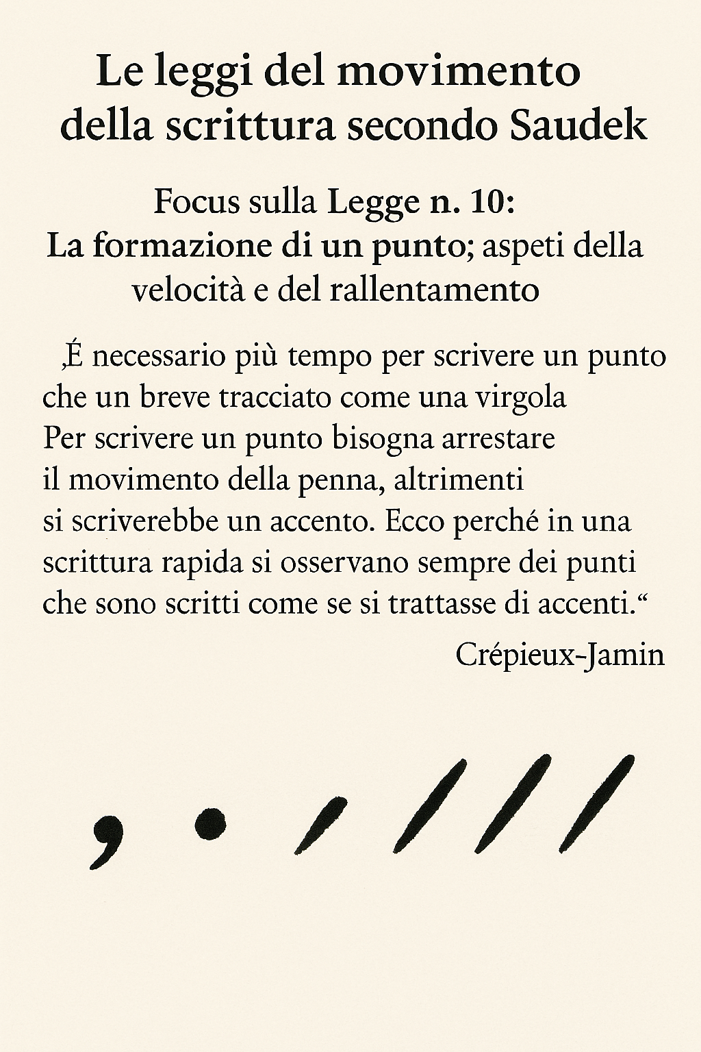 Le leggi del movimento della scrittura di Saudek descrivono la scrittura come un gesto fisico regolato da dinamiche costanti. Tra queste, la Legge 10 di Saudek dedicata alla formazione del punto rivela come un segno apparentemente minimo possa mostrare la velocità, il ritmo e la naturalezza del movimento scrittorio.